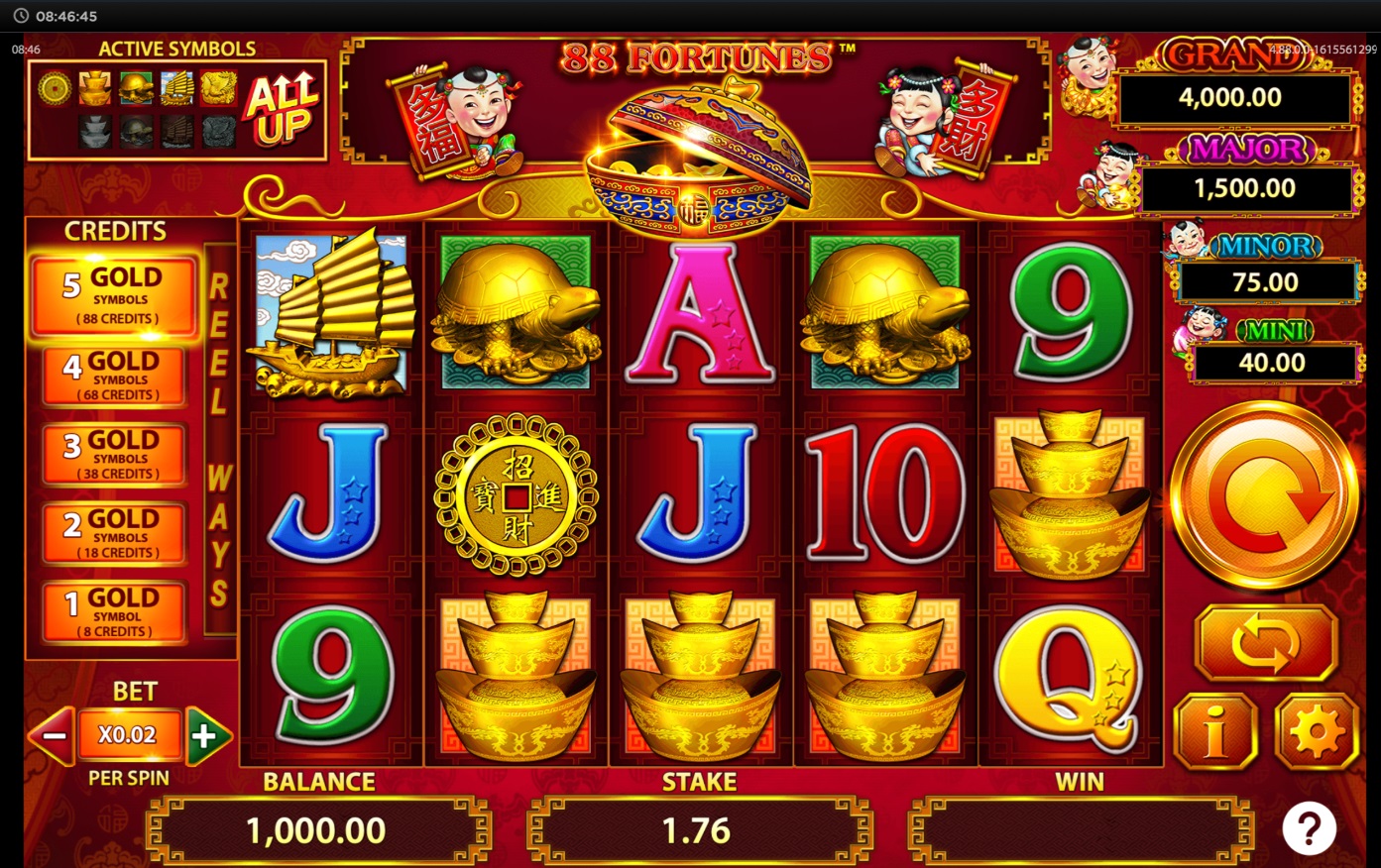88 Fortunes es una slot sólida dentro de su género, perfecta para quienes buscan la emoción de los jackpots progresivos que son cuatro: Grand, Major, Minor y Mini.