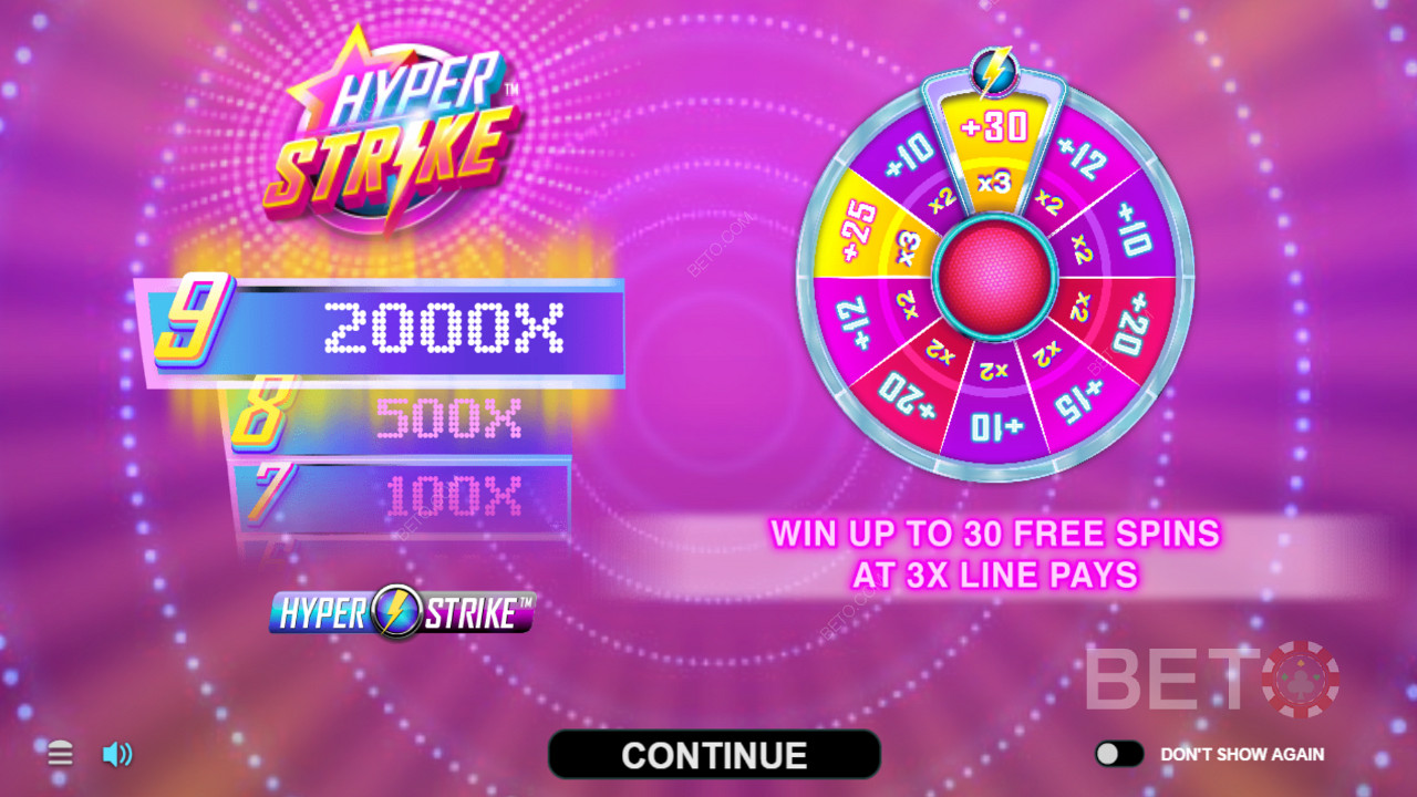 En Hyper Strike Hyperspins entrarás en la ronda de Tiradas Gratis cuando aparezca el símbolo "Free Spins". Deberás estar muy atento en los carretes 2, 3 y 4, necesitarás al menos tres símbolos para poder entrar en la ronda de Tiradas Gratis. Primero recibirás 1 Tirada, pero la ronda de Tiradas Gratis te mostrará una ruleta donde podrás ver cuántas Tiradas Gratis podrás recibir y el multiplicador que obtendrás: ¡Podrás conseguir hasta 30 Tiradas Gratis y multiplicarlas x3!